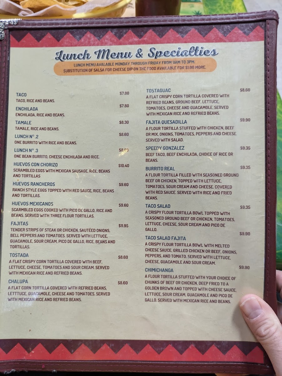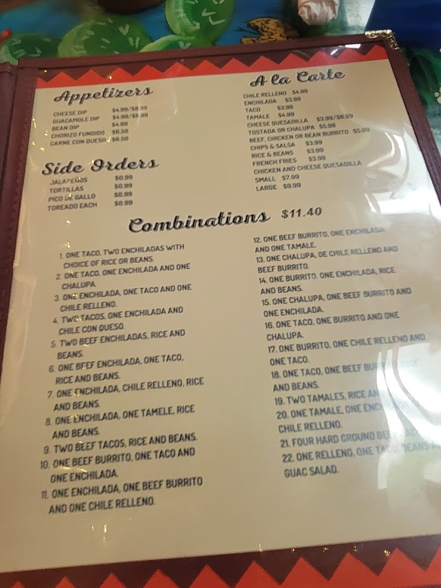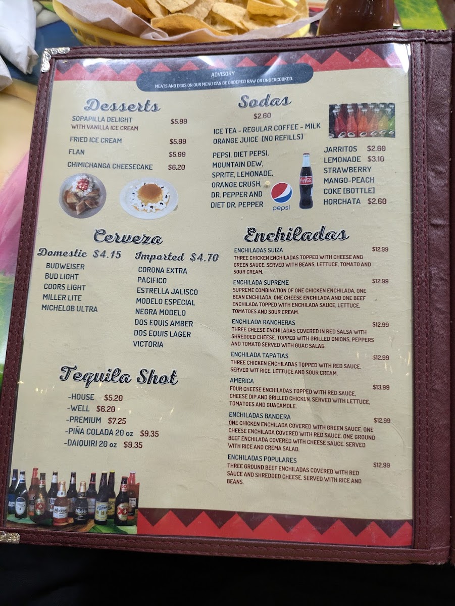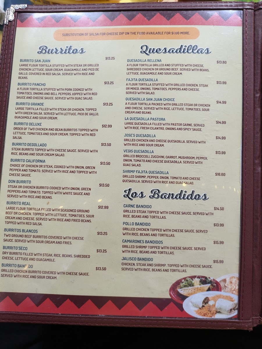 Burrito, chile relleno, taco with choice of grilled steak, chorizo, al pastor, grilled chicken, or carnitas.